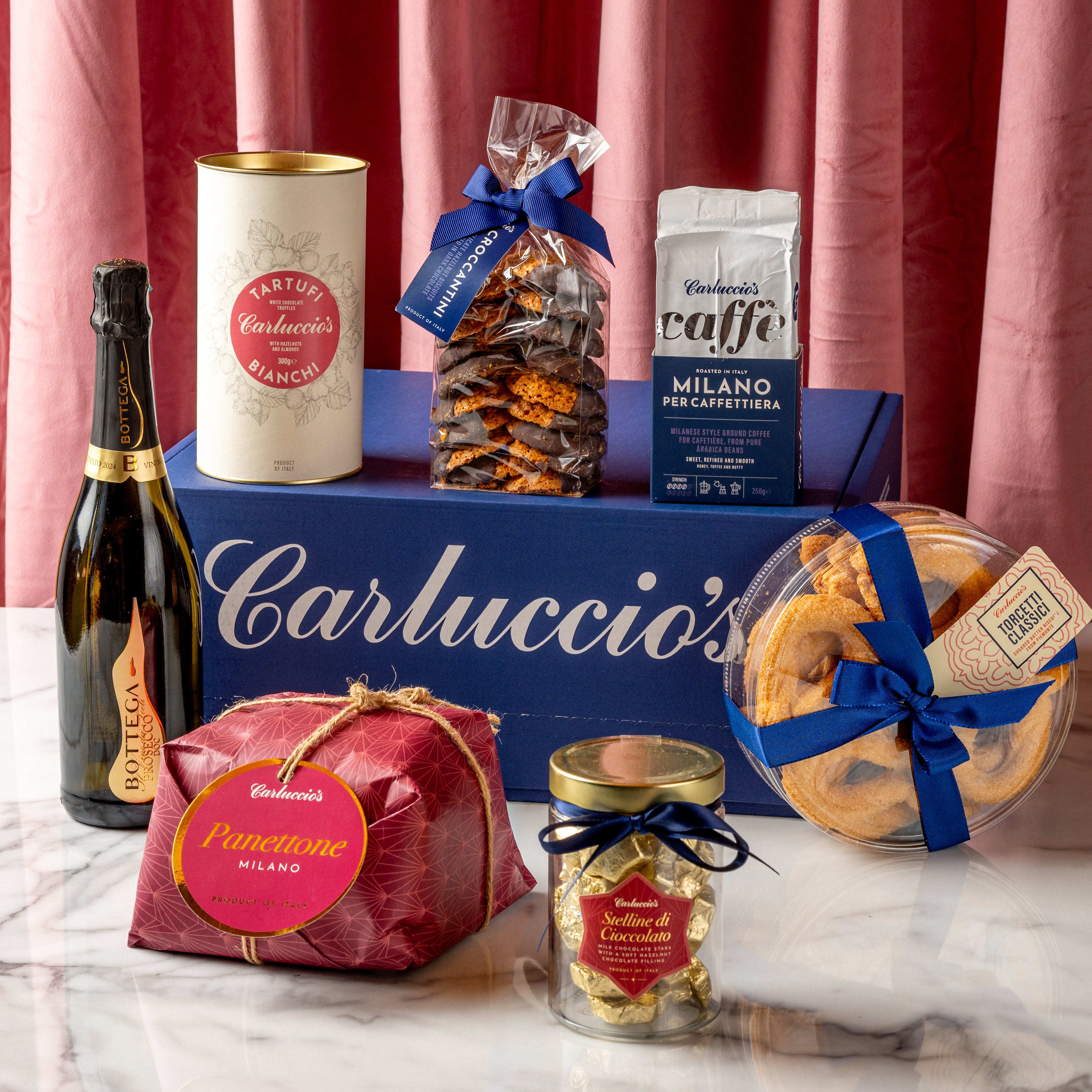 Packed with some of Carluccio's most classic sweet treats and biscuits, panettone Milano, Bottega Poeti Prosecco DOC and our Milano Coffee (Cafetiere grind).